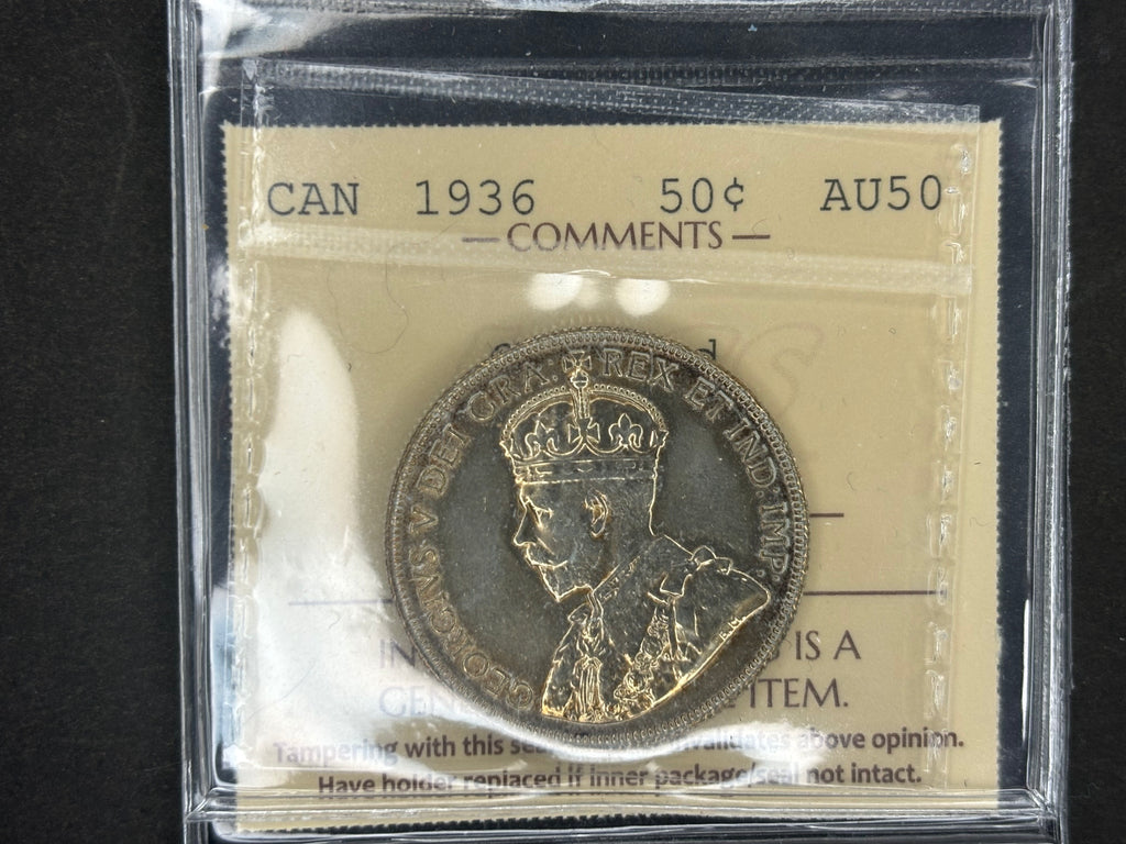 Canada Silver Coin - 50 cents - 1936 Cleaned ICCS AU50